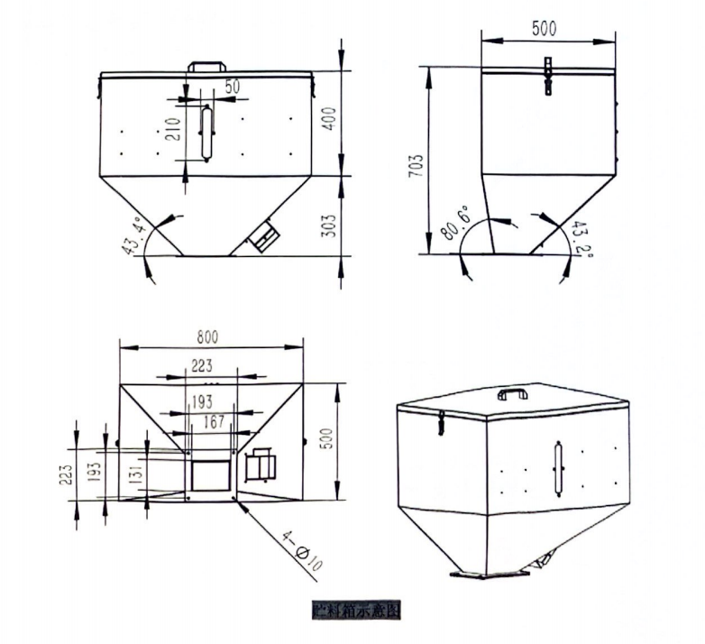 1.招標文件附件《貴州省密集烤房生物質(zhì)顆粒燃料內(nèi)置式燃燒機購置應用技術(shù)要求規(guī)范》“送料器”——“a)貯料箱”部分——“圖5 貯料箱及檔料板示意圖”以下圖為準: