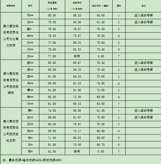 根據(jù)《貴州人才博覽會“職引前程點亮未來”高校畢業(yè)生專場招聘暨“國聘行動”貴州專場活動-貴州貴財招標有限責任公司招聘公告》,通過資格審查、筆試、面試環(huán)節(jié),經(jīng)公司黨委研究,現(xiàn)將最終成績及進入組織考察人員公告如下。